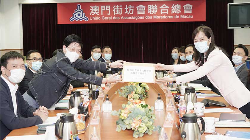 社會文化司司長歐陽瑜一行十二人拜訪街坊總會,街坊總會會長吳小麗、理事長陳家良,副會長何潤生、曾佐威、張麗珍、水超育、胡達忠、李卓君、姚嘉聰等多人接見。吳小麗在會上表示,社文司工作負擔因疫情大幅增加,對於近兩年來政府抗疫工作予以肯定。鑑於疫情期間居民生活壓力大幅增加,希望明年的民生福利不會削減,街坊總未來將會繼續支持政府,為澳門和諧穩定發展努力。