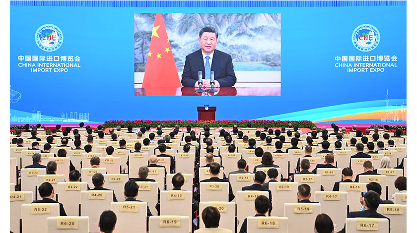 11月4日晚,國家主席習近平以視頻方式出席第四屆中國國際進口博覽會開幕式並發表題為《讓開放的春風溫暖世界》的主旨演講。 新華社