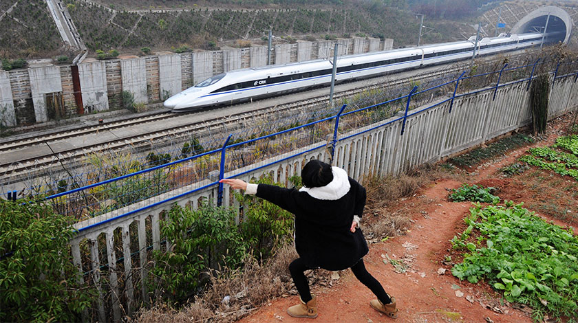 中國改革開放四十年,也是中國交通發展變革的四十年,現代化的高速鐵路、廣泛覆蓋的民用航空、發達的城市軌道以及高效便捷的網約車等豐富多樣的出行模式,悄然改變著中國人的生活方式和思維方式,在世界交通運輸史上創造了舉世矚目的『中國速度』和『中國模式』。圖為2012年12月26日,京廣高鐵正式全線通車,一位長沙市民在高鐵列車經過時擺出了『高鐵style』的手勢。(中新社圖片/ 楊華峰 攝)