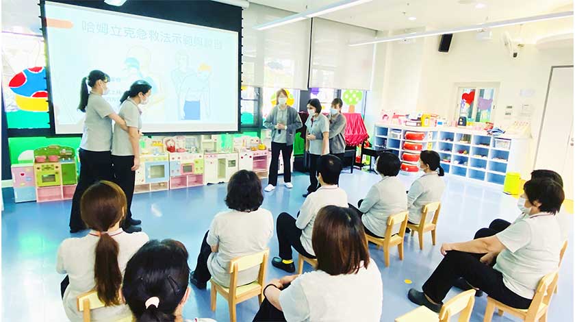 為增強員工們團體意識和協作精神,托兒所培訓日當天進行多個團建遊戲,讓員工從中學習共同解決問題技巧及有效溝通方法,提升團隊默契,其中「工作互換體驗」遊戲更是讓他們能夠體驗不同崗位的工作任務,通過換位思考、交流及溝通,更好了解同事之間的工作內容,從以提升相互之間的協作能力、工作效率及語言表達能力。於「工作安全指引」培訓內容中,因應新冠疫情影響,為更好進行應變及防疫措施,托兒所安排護士向員工加強衛生教育及保健工作,以預防和減少疾病發生,保障幼兒身心健康。托兒所同時安排了基本應用急救知識培訓(如哈姆立克法練習),讓員工提升對急救的理解,明白其重要性。