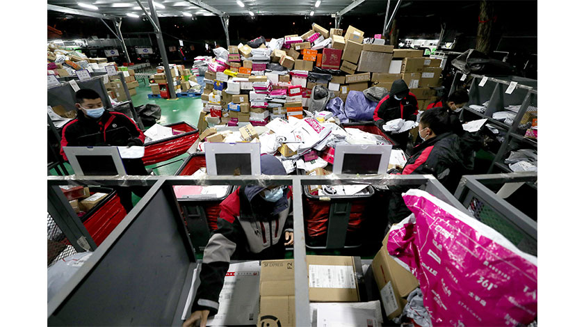 11月18日,中國國家郵政局公佈數據顯示,今年『雙11』期間(11月1日至16日),全國郵政、快遞企業共攬收快遞包裹68億件,同比增長18.2%;共投遞快遞包裹63億件,同比增長16.2%。圖為11月12日,北京順豐速運陶然亭分部快遞員分揀快遞。中新社