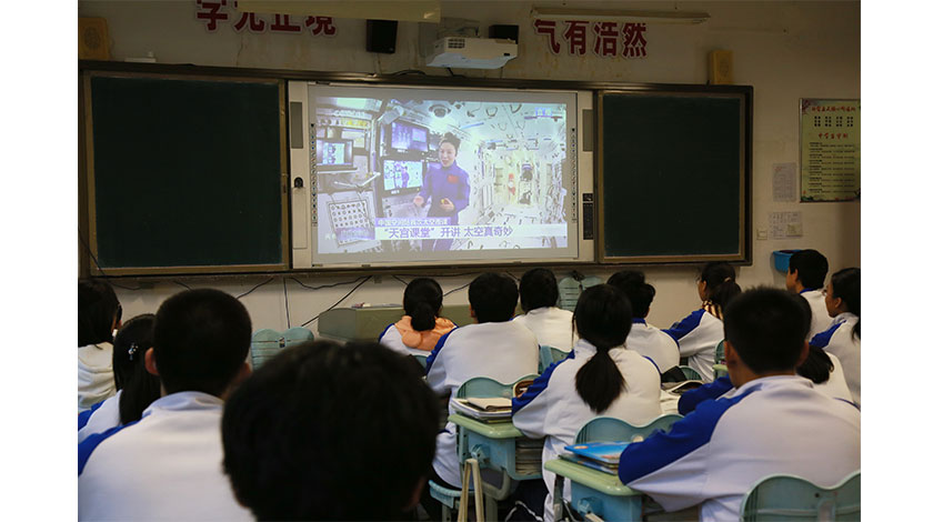 9日,在位於煙台的山東省福山第一中學,學生們收看『太空教師』翟志剛、王亞平、葉光富在中國空間站帶來的太空科普課。山東煙台是航太員王亞平的家鄉,山東省福山第一中學是王亞平的母校。當日下午,中國空間站首次太空授課正式開講。中新社