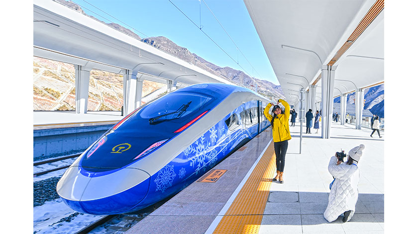 6日,奧運版復興號智能動車組在京張高鐵上線開行。該動車組編組8輛,定員564人,設商務、一等、二等、媒體車廂;外觀採用『瑞雪迎春』塗裝方案,整體顔色中點綴若隱若現的雪花和運動元素,彰顯冬奧主題。圖為列車停靠在崇禮站。 中新社