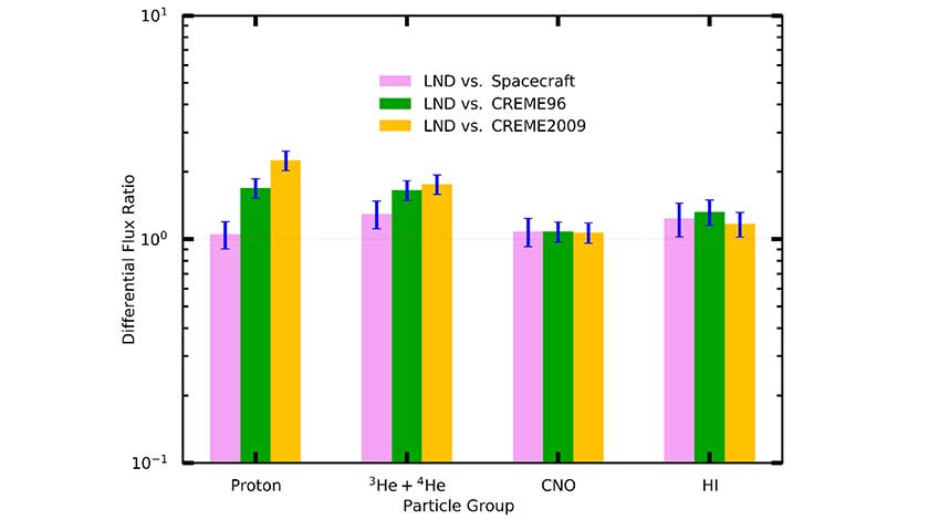 宇宙綫強烈地影響著空間環境,深入了解宇宙綫的成分及能譜,有助於更好地評估空間環境中的輻射水準,這對於人類的深空探測活動具有重要意義。研究團隊系統測量了2019/2020太陽活動極小期月球表面低能宇宙綫質子,α粒子,CNO及重離子能譜。資料表明月球表面和日地L1點探測衛星獲取的低能宇宙綫能譜一致。觀測數據證實了宇宙綫通量的晨昏對稱性,表明嫦娥四號著陸區月球環境如磁異常區對宇宙綫通量的影響可以忽略。團隊還提取了He同位素比值,發現在~12MeV/nuc有顯著增強。測量得到的宇宙綫質子和α粒子能譜,與廣泛使用的CRÈME模型預測之間存在顯著差異,對宇宙射綫輸運模型提出了挑戰。這些首次就位探測獲得的月面宇宙射綫能譜資料為深入研究宇宙綫與月面的相互作用及未來載人月球任務中的輻射防護提供了第一手觀測資料。