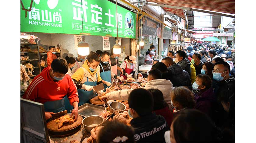 1月31日,市民在市場花店購買鮮花。當日是中國除夕,在辭舊迎新之際,昆明市的篆新農貿市場熱鬧非凡,眾多市民前來採購雞鴨魚肉、鮮花、水果、米線、八寶飯等年貨。 (中新社)