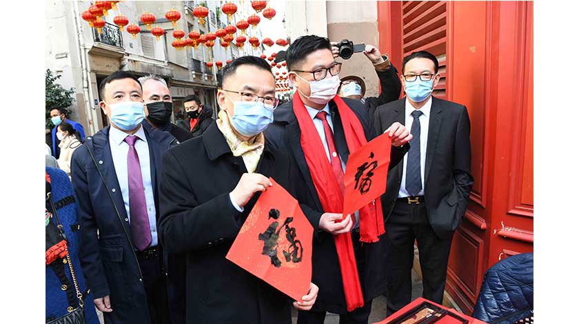 當地時間1月30日,中國駐法國大使盧沙野(前左)走訪慰問巴黎中心區僑胞,參觀法國華僑華人會會址,並與旅法僑團座談。( 中新社)