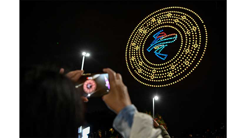1月30日晚,廣東省廣州市,無人機在花城廣場上空組成獎牌圖案。當晚,廣州舉辦“慶新春 迎冬奧”主題無人機編隊飛行表演,1000架無人機獻上“空中賀禮”,迎接新春冬奧。(中新社)