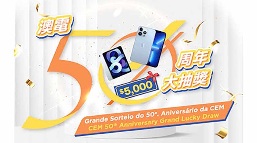 【特訊】2022年為澳門電力股份有限公司(澳電)成立50周年誌慶。為了答謝市民一直以來的支持,澳電將於年內推出一系列的精彩慶祝活動。誠邀全澳市民參加由即日起至3月8日舉行的「50周年大抽獎」,有機會贏取iPhone13Pro、iPadAir、5000澳門元電器禮券或電費額、電費回贈,以及澳電精美紀念品等逾6000份豐富獎品!市民只需於澳電或MOMEPlay微信內登入遊戲,完成任務即有機會贏大獎或兌換精美紀念品。