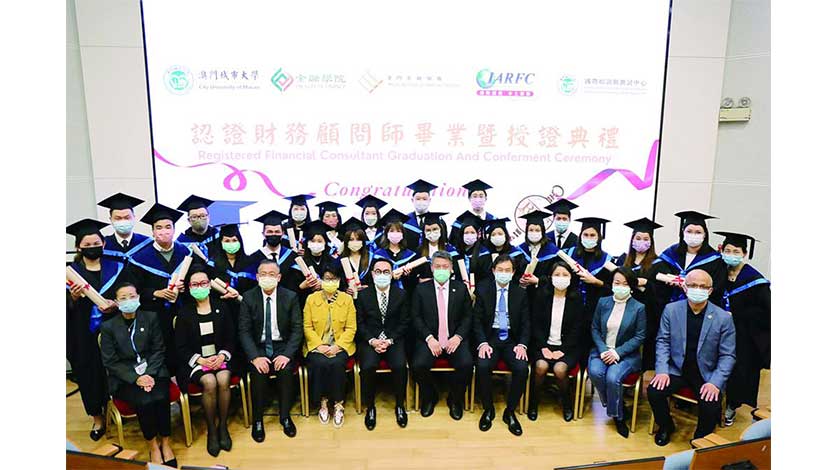 【特訊】二○二一年度“認證財務顧問師畢業暨授證典禮”日前於澳門城市大學氹仔校區何賢會議中心圓滿完成。城大校長劉駿、澳門金融學會管理委員會副主席陳偉成擔任主禮嘉賓,並為學員頒授專業證書。