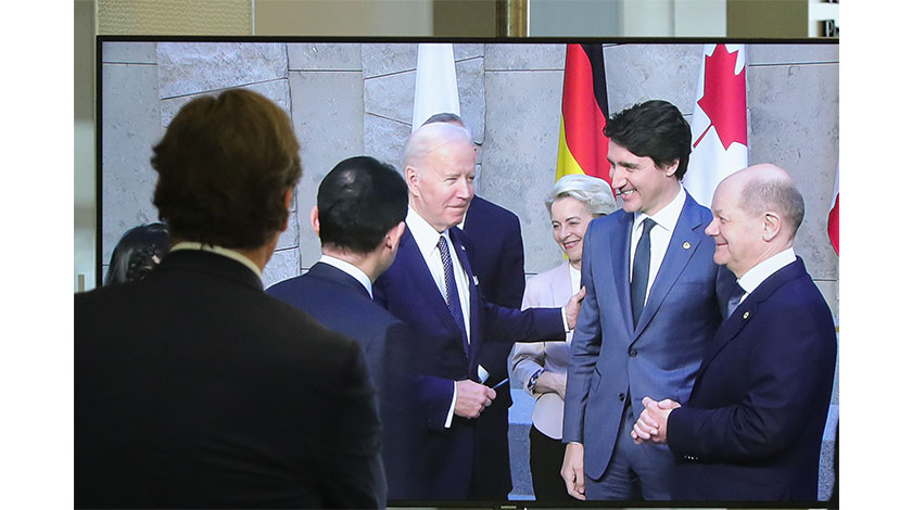 3月24日,在比利時布魯塞爾的北約總部,一名男子觀看屏幕上美國總統拜登(右四)、歐盟委員會主席馮德萊恩(右三)、加拿大總理特魯多(右二)、德國總理朔爾茨(右一)出席七國集團峰會合影儀式的畫面。新華社