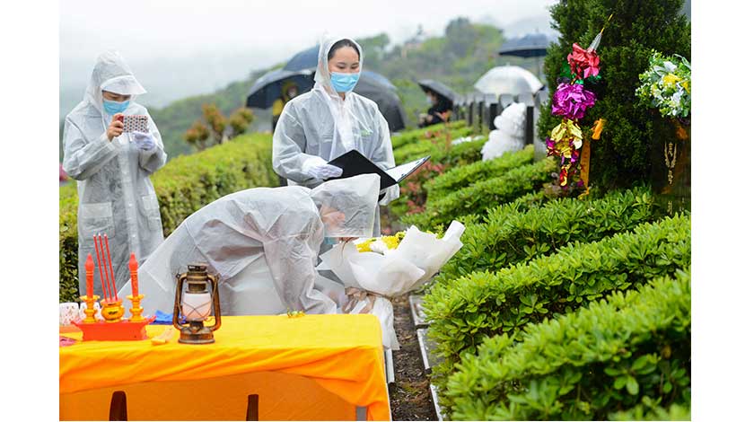 3月31日,重慶靈安陵園,禮儀師正在進行『代客祭掃』服務。清明將至,為適應疫情防控形勢,重慶南岸區靈安陵園推出『代客祭掃』服務,由工作人員提供擦拭墓碑、敬獻鮮花等祭掃服務,並通過手機拍攝記錄代祭過程,發送給逝者親屬。 (中新社)