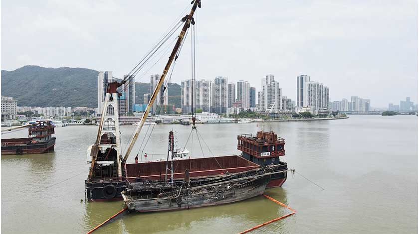 早前內港的漁船火警六艘涉事漁船中,一艘漁船由海事局救援船拖回岸邊,有一艘漁船隨水漂流至內港客運碼頭對開的一段內港航道並下沉,另有四艘相連漁船在內港錨地下沉。海事局全力協助下沉漁船的打撈和善後工作,安排打撈船隊到現場進行評估及擬定計劃,並於昨日早上開始打撈作業。