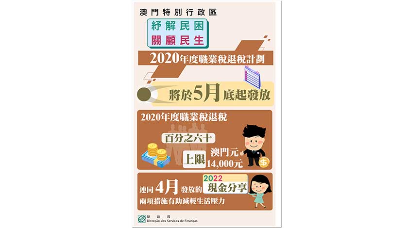 根據第21/2021號法律《2022年財政年度預算案》第21條的規定,財政局將向2020年12月31日持有澳門特區居民身份證並已繳納2020年度職業稅稅款的納稅人,退回百分之六十稅款,上限為14000元,詳情稍後公佈。