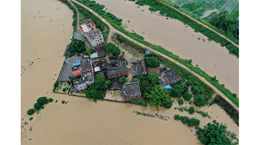 5月11日,廣東省廣州市,從化上西村村內低窪處的房屋被積水包圍,房屋右側的潖江水流渾濁。當日,廣州出現暴雨到大暴雨,局部特大暴雨,強降水中心集中在從化、花都北部及增城北部。 中新社