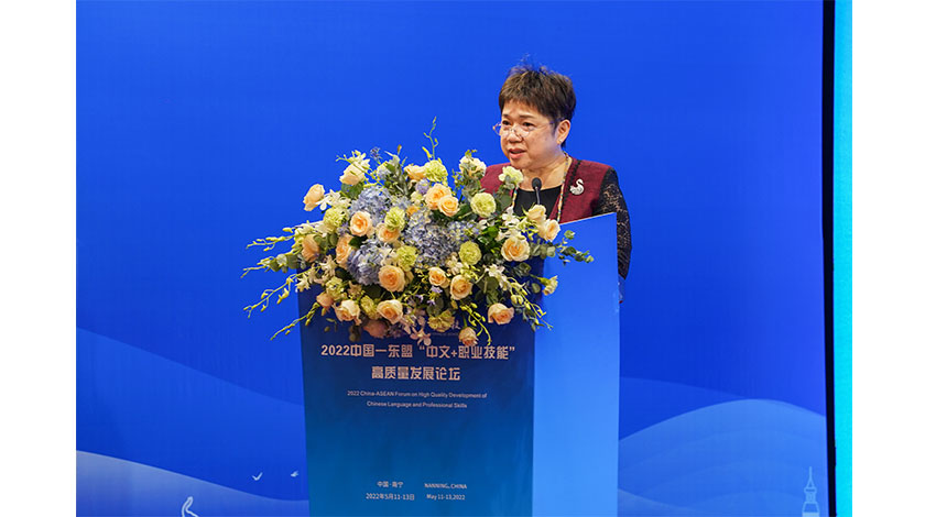 5月12日,中國—東盟『中文+職業技能』高質量發展論壇以線上線下相結合方式在廣西南寧舉行。圖為泰國駐南寧總領事彬嘉瑪•塔維她雅濃在開幕式上致辭。 中新社
