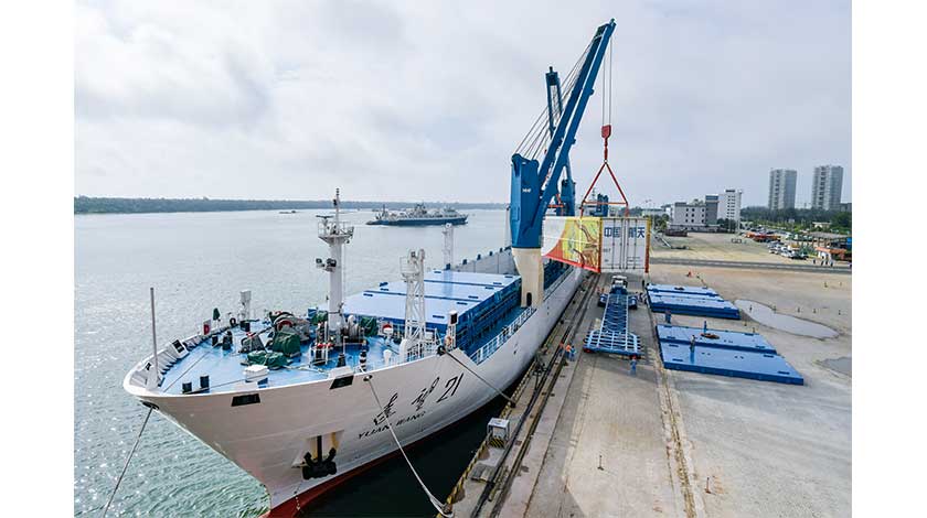 29日,據中國載人航天工程辦公室消息,長征五號B遙三運載火箭已完成出廠前所有研製工作,安全運抵中國文昌航天發射場。該火箭計劃7月執行空間站問天實驗艙發射任務。之後,長征五號B遙三運載火箭將與先期運抵的問天實驗艙一起開展發射場區總裝和測試工作。目前,發射場區各參試系統正在按計劃開展任務準備。圖為長征五號B遙三運載火箭運抵海南文昌清瀾港後進行卸載作業。 中新社