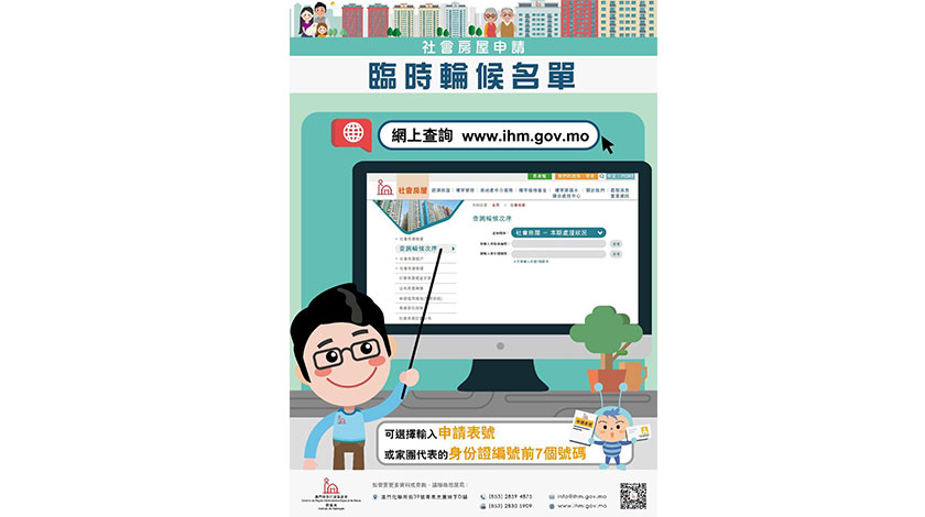 申請人亦可瀏覽房屋局網頁(www.ihm.gov.mo)內,社會房屋欄目的查詢輪候次序,選擇輸入申請表號,或家團代表的身份證編號前7個號碼,即可顯示查詢申請之排序或除名原因。