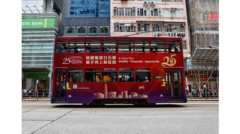 6月16日起至8月9日,香港屈地街電車廠至跑馬地總站來回有數輛電車車身張貼出慶香港回歸祖國25周年等廣告字樣,在鬧市中心穿梭出紅火動感。(香港中通社)
