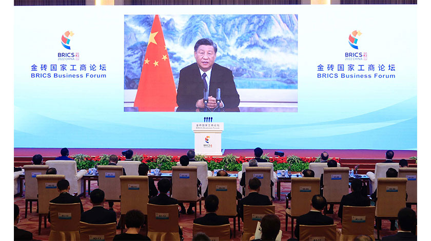 【中新社北京6月22日電】中國國家主席習近平22日晚以視頻方式出席金磚國家工商論壇開幕式併發表題為《把握時代潮流締造光明未來》的主旨演講。