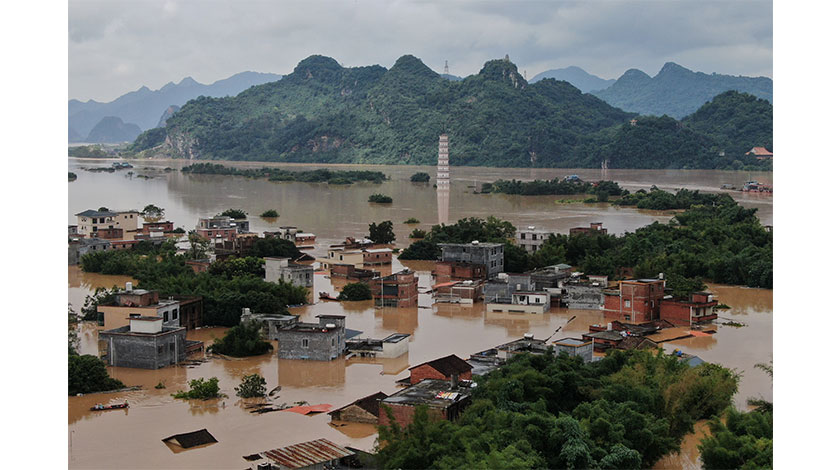 6月22日,廣東省清遠市英德市市區北江洪峰過境,臨近北江低窪處房屋被水浸泡。當日14時,北江幹流英德(五)站出現35.97米洪峰水位,超警戒9.97米。中新社