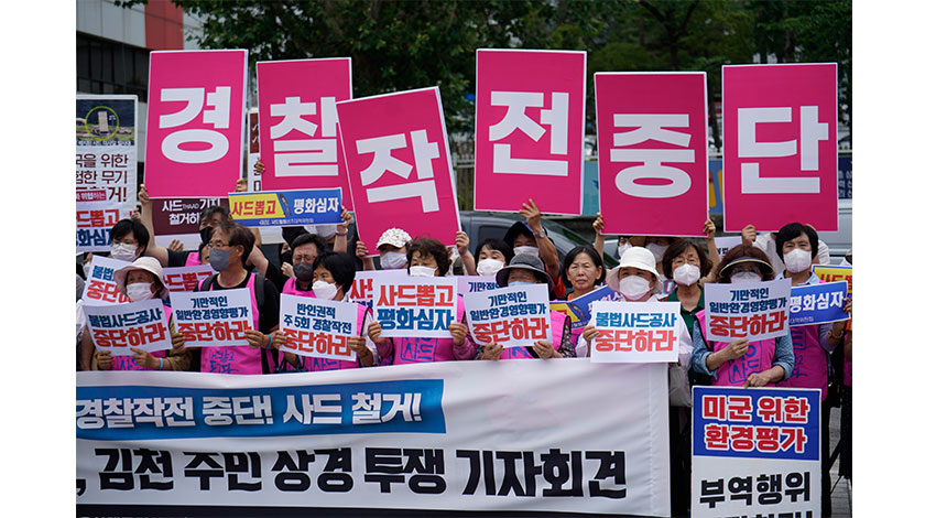 當地時間6月23日,來自『薩德』反導系統在韓部署地的民眾來到首爾市龍山區韓國總統府前舉行抗議集會,呼籲韓國政府將『薩德』系統撤出韓國。圖為示威群眾。 中新社