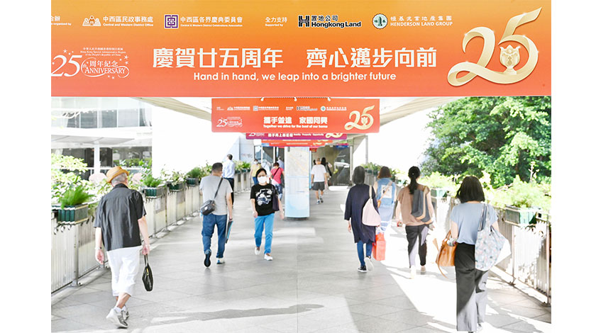 6月23日,隨著香港回歸祖國25週年紀念日臨近,香港上環及中環隨處可見慶祝香港回歸25週年的海報及橫幅,慶回歸主題巴士和電車在街頭穿梭,洋溢著濃濃的喜慶氣氛。圖為上環連接中環的天橋上掛滿慶回歸橫幅。(中新社)