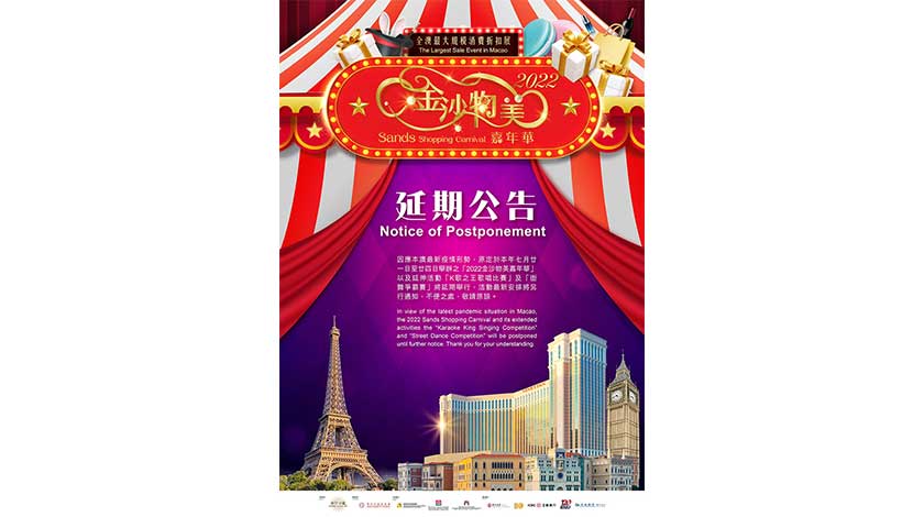 【特訊】因應本澳最新疫情形勢,金沙中國有限公司宣佈原定於本年7月21日至24日舉辦之「2022金沙物美嘉年華」以及延伸活動「K歌之王歌唱比賽」及「街舞爭霸賽」將延期舉行。活動最新安排將另行通知。