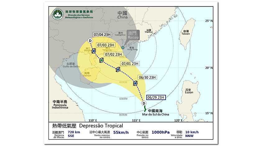 受該熱帶低氣壓的環流及雨帶影響,預料今日晚間開始本澳天氣轉趨不穩定,周五(1日)至周日(3日)本澳風勢將有所增強,驟雨漸趨頻密及有雷暴,氣象局表示會密切留意該熱帶低氣壓的最新動態,籲市民留意最新天氣資訊。