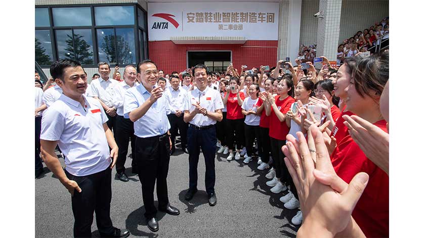 7月7日至8日,中共中央政治局常委、國務院總理李克強在福建福州、泉州考察。這是8日上午,李克強在安踏集團考察時同員工親切交流。新華社