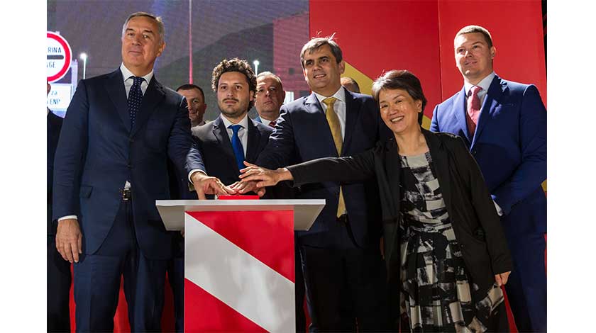 7月13日,在黑山首都波德戈里察,黑山總統久卡諾維奇、總理阿巴佐維奇、副總理易卜拉希莫維奇和中國駐黑山大使館臨時代辦華亞芳(前排從左至右)出席黑山南北高速公路優先段通車儀式。由中國企業承建的黑山南北高速公路優先段通車儀式13日晚在黑山首都波德戈里察舉行。新華社