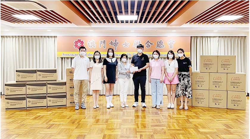 劉金玲感謝新忠誠集團關心社會,關懷婦幼,為抗疫工作貢獻力量。婦聯將繼續積極配合特區政府各項防疫抗疫措施,投入疫戰工作,與全澳市民一起,守望相助、共渡時艱,為堅決打贏疫情防控阻擊戰貢獻婦女團體的力量,共建澳門美好家園。出席的還有新忠誠集團執行董事胡孫佳淇、甄志鋒及胡小慧。