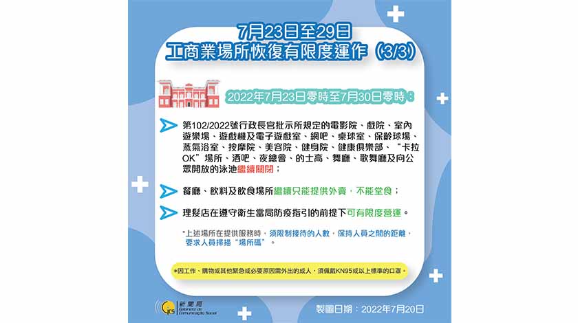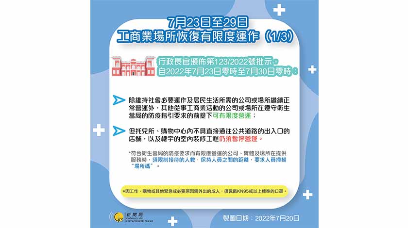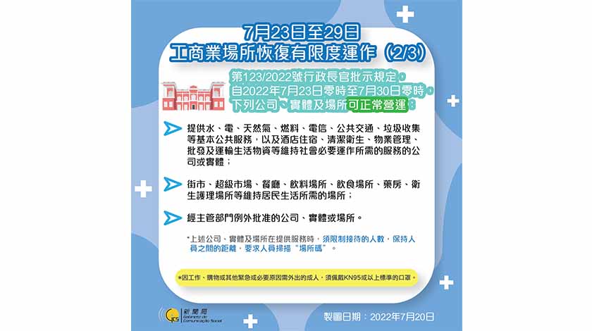 行政長官賀一誠昨作批示,自二零二二年七月二十三日零時至七月三十日零時,即為期一個星期的時間裡,命令適用多項特別措施,以防止新冠病毒肺炎在澳門特區的傳播。