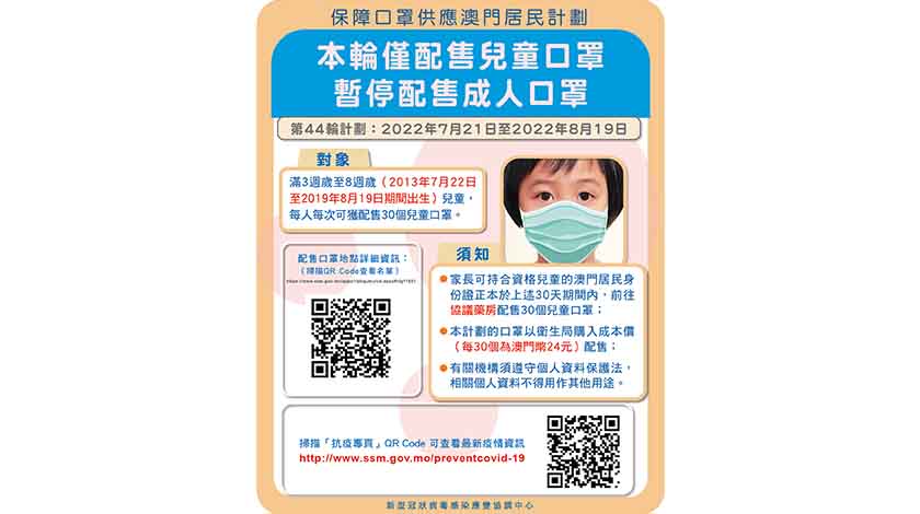 新型冠狀病毒感染應變協調中心昨日公布,第四十四輪保障口罩供應澳門居民計劃於今日開始,配售期間為三十天,即本月廿一日至八月十九日,期間僅配售兒童口罩,暫停配售成人口罩,敬請留意。
