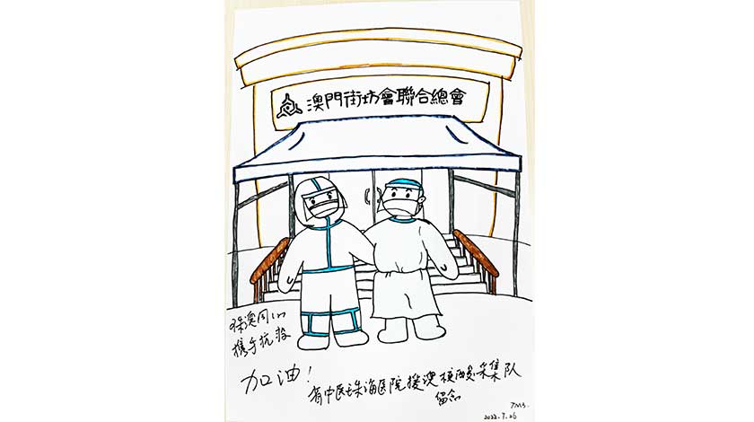 【特訊】6月18日,新一波新冠疫情襲澳,是澳門回歸以來最嚴峻的一次公共衛生大災難。經過三十多天、一系列嚴格的管控措施下,本澳終於迎來首次全面清零的大好局面,抗疫工作取得階段性的成果。期間有賴全民的共同參與、齊心抗疫,亦特別感謝廣東省援澳採樣醫療隊650位醫護人員對本澳今波疫情的馳援,讓這場疫戰取得了初步勝利。援澳醫療隊為答謝全澳市民的支持和厚愛,親手繪畫了三幅漫畫並贈予街坊總會,以表達友好情誼,同時藉此向澳門市民致以真摯的祝福。