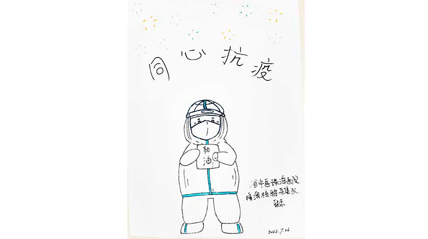 援澳醫療隊分隊隊長李玲表示,援澳醫療隊的隊員曾多次馳援湖北武漢、深圳、廣州,有豐富的核酸採集經驗。在這次援澳核酸採集工作中,隊員都高效、專業地完成了多輪的全民核檢。在共同抗疫過程中,與街坊總會工作人員合作得非常默契,工作人員均十分熱情和很有耐心,讓他們有很大的觸動,亦建立了深刻的友誼。欣慰的是,經過這麼長時間在澳門工作,疫情得到初步有效的控制,她祝愿澳門能夠早日回復平和、安寧的生活環境,大家可以安心地生活和工作。臨別在即,隊員們都依依不捨,因此親手畫了三幅漫畫,向市民致以衷心的祝福,澳門加油!