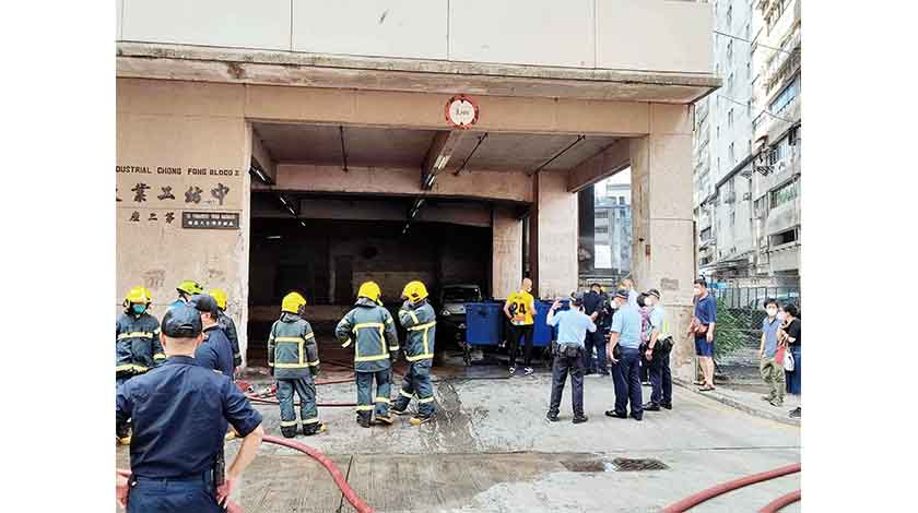 昨日上午九時許,馬揸度博士大馬路中紡工業大廈第二座,有搬運工人發現上落客貨區有一個大型藍色垃圾桶起火,火勢猛烈,多名工人於現場合力撲火。現場冒出大量濃煙,沿工廈外牆直捲上天。