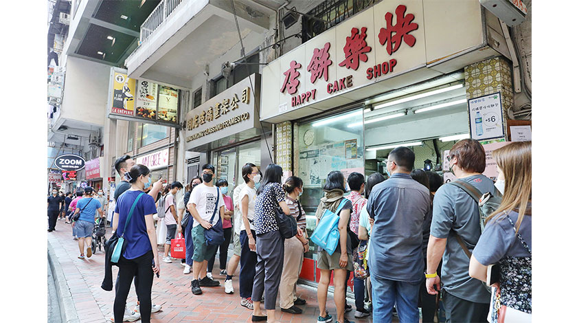 7月28日,大批香港市民在灣仔“快樂餅店”排隊打卡。擁有45年歷史的老字號餅店“快樂餅店”27日宣佈,將於下週二(8月2日)結業。“快樂餅店”自70年代起開業,主打多款傳統港式麵包及中式糕點,其中最為受歡迎的是近乎已經失傳的懷舊忌廉筒(又稱奶油筒)。(香港中通社)