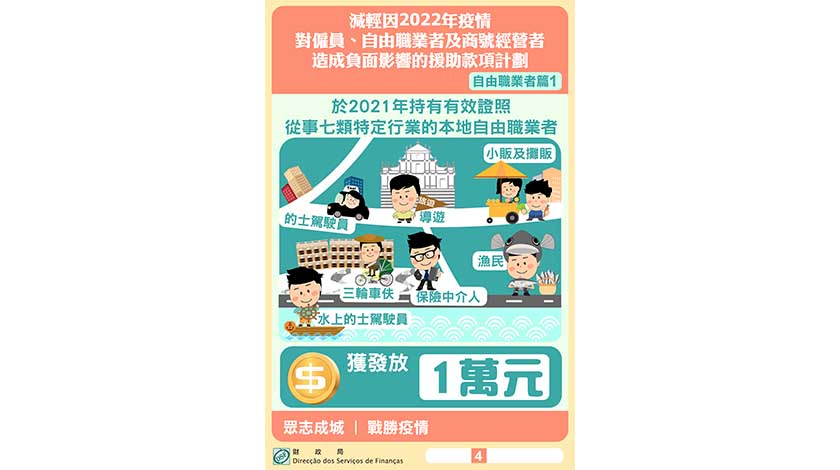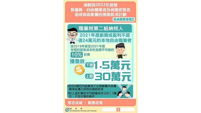 二、自由職業者援助款項。向二零二一年度職業稅申報的營業結果非為盈利,又或雖為盈利但金額不超過澳門元廿四萬元的職業稅第二組納稅人中的澳門居民,按其最近三年度申報的職業稅負擔金額平均值的百分之十計算,每人發放至少澳門元一萬五千元及最多澳門元卅萬元的援助款項。另外,亦向持有有效證照的士駕駛員、三輪車伕、小販及攤販、導遊、水上的士駕駛員、漁民及保險中介人,每人發放澳門元一萬元的援助款項。