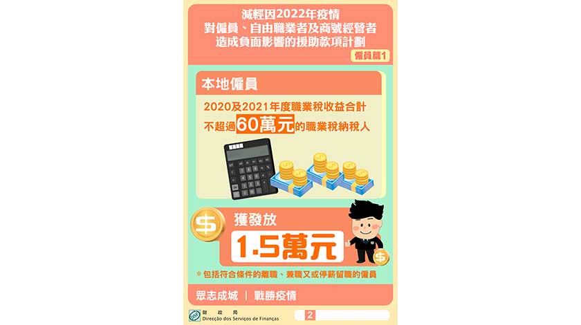 一、僱員援助款項。向二零二零年至二零二一年職業稅收益總金額不超過澳門元六十萬元的職業稅第一組納稅人中的澳門居民,包括受本次疫情影響的符合條件的停工停業、失業或開工不足的僱員,每人發放澳門元一萬五千元的援助款項;此外,將僱員援助款項的惠及範圍進一步作出合適的擴大,符合條件的失業居民,可透過申請例外地獲發僱員援助款項。