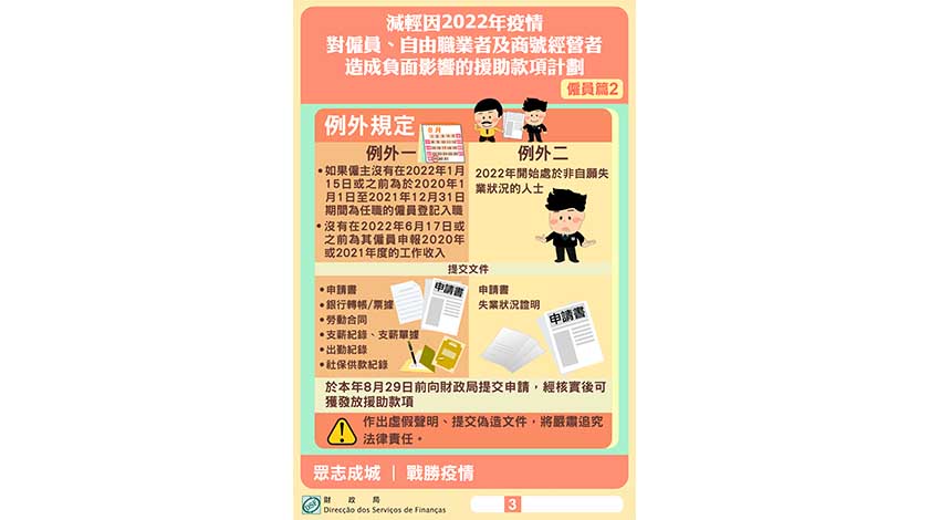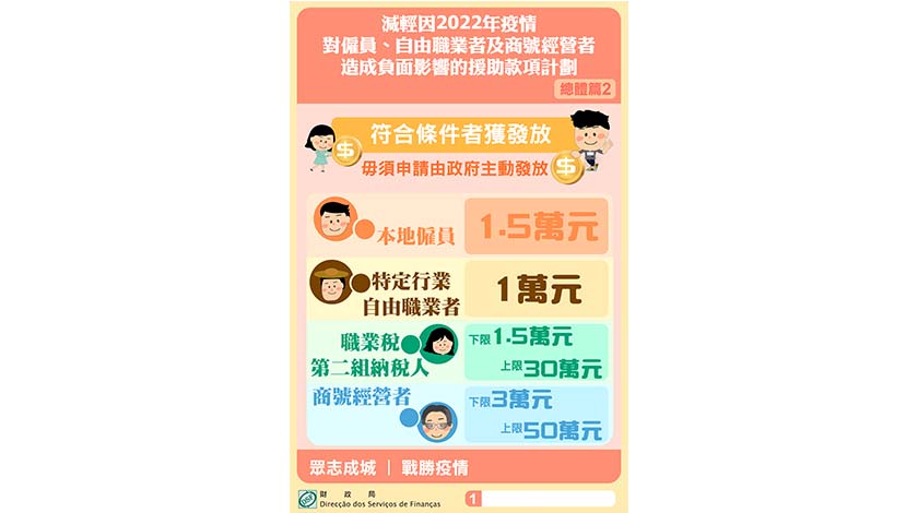 行政會完成討論《減輕因二零二二年疫情對僱員、自由職業者及商號經營者造成負面影響的援助款項計劃》行政法規草案,行政法規自公布翌日起生效。行政法規的主要內容如下: