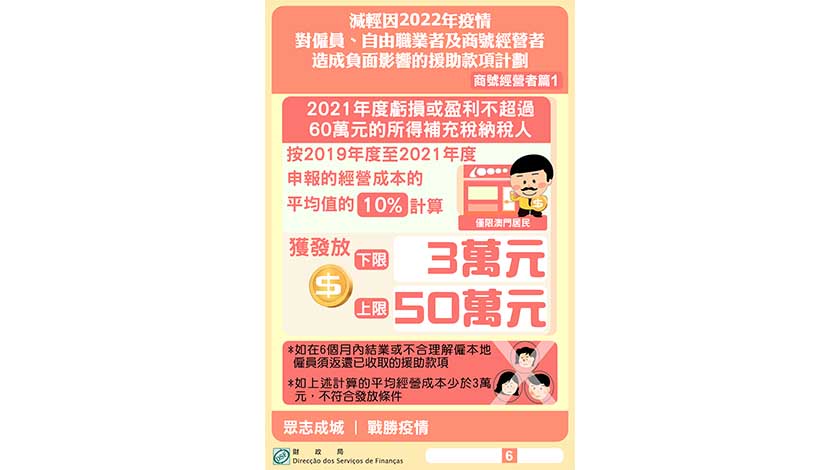 三、商號經營者援助款項。向二零二一年度所得補充稅申報的營業結果的總和非為盈利,又或雖為盈利但金額不超過澳門元六十萬的所得補充稅納稅人,按有關商號最近三年度申報的經營成本平均值加總後的百分之十計算,每人發放至少澳門元三萬元及最多澳門元五十萬元的援助款項。
