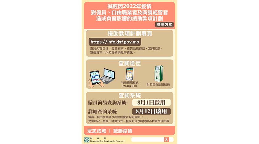 【本報訊】政府推出援助款項計劃,合資助的僱員、自由職業者、商號經營者均獲發放,分批發放由八月十七日開始。財政局局長容光亮表示,政府多年推出經援措施,主要為了保持經濟活力,令到經濟活動可以持續,加強市民信心、增加消費,避免經濟走向衰退。