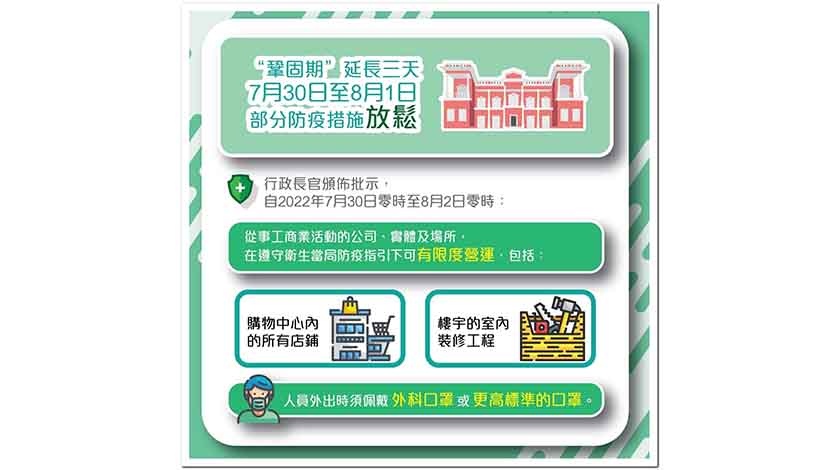 另外行政公職局表示,為貫徹特區政府的疫情防控方針,同時兼顧公眾急需的公共服務,特區政府決定於延長的疫情防控鞏固期內,公共部門將繼續提供有限度的對外服務。為最大程度避免人員聚集,減低病毒感染的風險,市民應事先透過網上或電話預約申請有關服務。