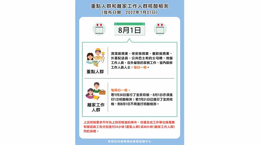 當中離家工作人群按當局此前版本是至七月廿九日。中心指,若有關人士在前天(三十日)做全民核檢,那須在今再做一次核檢;若是在三十一日做的,則今不用再做。當局此前指,在之後「穩定期」離家工作人群要三天一檢。