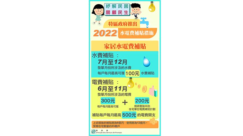 【特訊】為紓緩新冠肺炎疫情對民生和經濟的影響,特區政府早前公佈的“2022家居及企業商號水電費補貼措施”已於6月起實施。家居及企業商號用戶請留意發單月份為6月份的電費單以及7月份的水費單(第四期繳費通知單),水電費補貼會從發單月份所涉及的水電費開支中自動扣除。