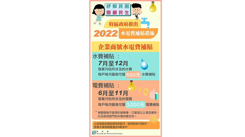 企業商號水電費補貼措施方面,水費補貼措施補貼非住宅用戶本年7至12月發單月份所涉及的水費開支,每戶每月最高500元。電費補貼措施則補貼非住宅用戶本年6至11月發單月份所涉及的電費開支,每戶每月最高3000元。有關措施不適用於娛樂場、三星或以上酒店場所,以及政府部門的水電供應合約。