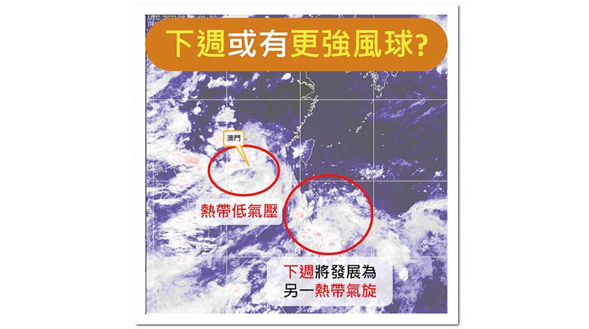 氣象局預測,本周末於菲律賓沿海會有另一熱帶氣旋形成,預料於下周初進入南海逐漸移近廣東沿岸,雖然其路徑及強度仍存在一定的不確定性,但預計會較昨日消散的熱帶低氣壓為強,並將為本澳帶來較顯著的狂風驟雨。