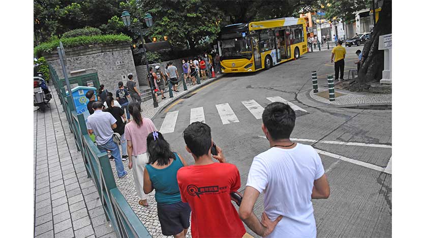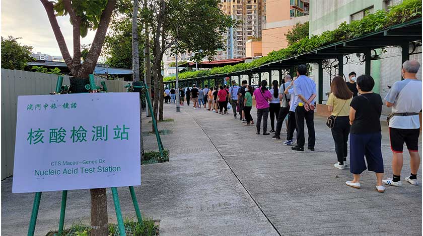 昨日下午四時前,一些核檢站仍未開站已有數以百計的人在排隊等候,運動場圓形地戶外核檢站人龍圍了兩圈、三家村戶外核檢站近二百人排隊、中央公園戶外核檢站超過二百人輪候;奧林匹克體育中心室內體育館(氹仔運動場)核檢站二百多人輪候。
