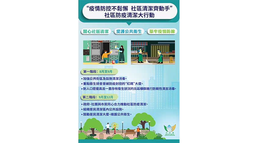 以“疫情防控不鬆懈,社區清潔齊動手”為口號的社區防疫清潔大行動為期五個月,期望在防疫常態化下,全澳市民合力維護社區整體環境衛生,杜絕疫病傳播隱患。