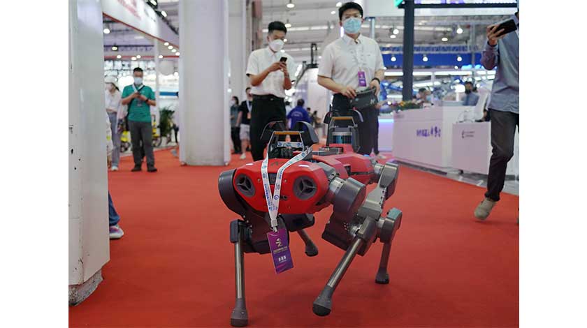 8月18日在2022世界機器人博覽會上拍攝的機械狗。當日博覽會開幕。本屆博覽會展覽面積達4萬平方米,共有130余家企業攜500餘件展品亮相,30餘款全球首發新品將在博覽會現場集中發佈。 新華社